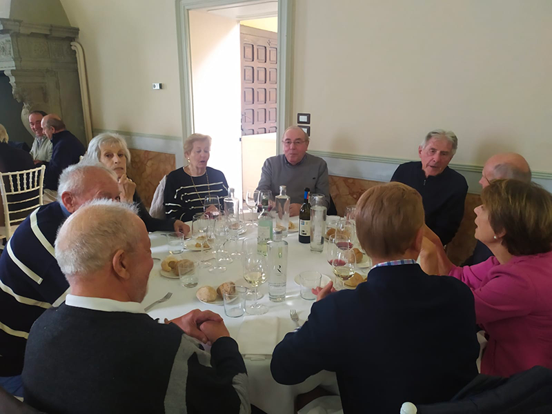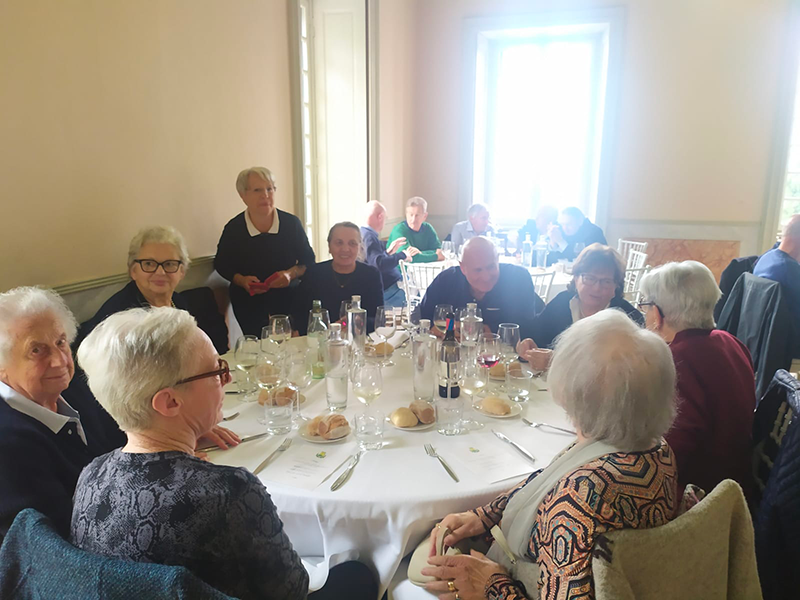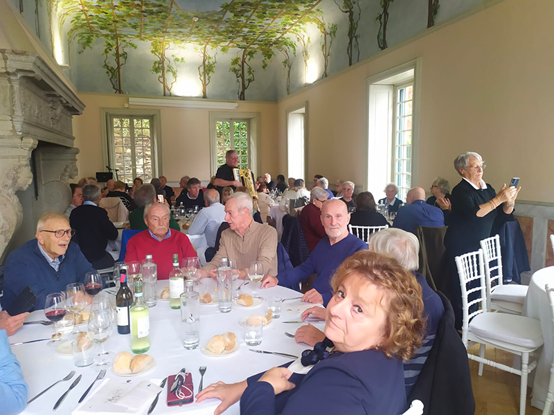 Al termine della funzione religiosa, gli ospiti si sono trasferiti nella splendida “Sala del Pergolato” di Villa Cipressi, affacciata sui giardini e sul lago, dove li attendeva un pranzo conviviale preparato con grande cura. Il menù, ispirato ai sapori della tradizione locale, ha conquistato i commensali, che hanno potuto gustare piatti genuini in un’atmosfera di allegria e serenità. La sala, elegantemente allestita per l’occasione, ha fatto da cornice a momenti di dialogo, ricordi condivisi e nuove amicizie.