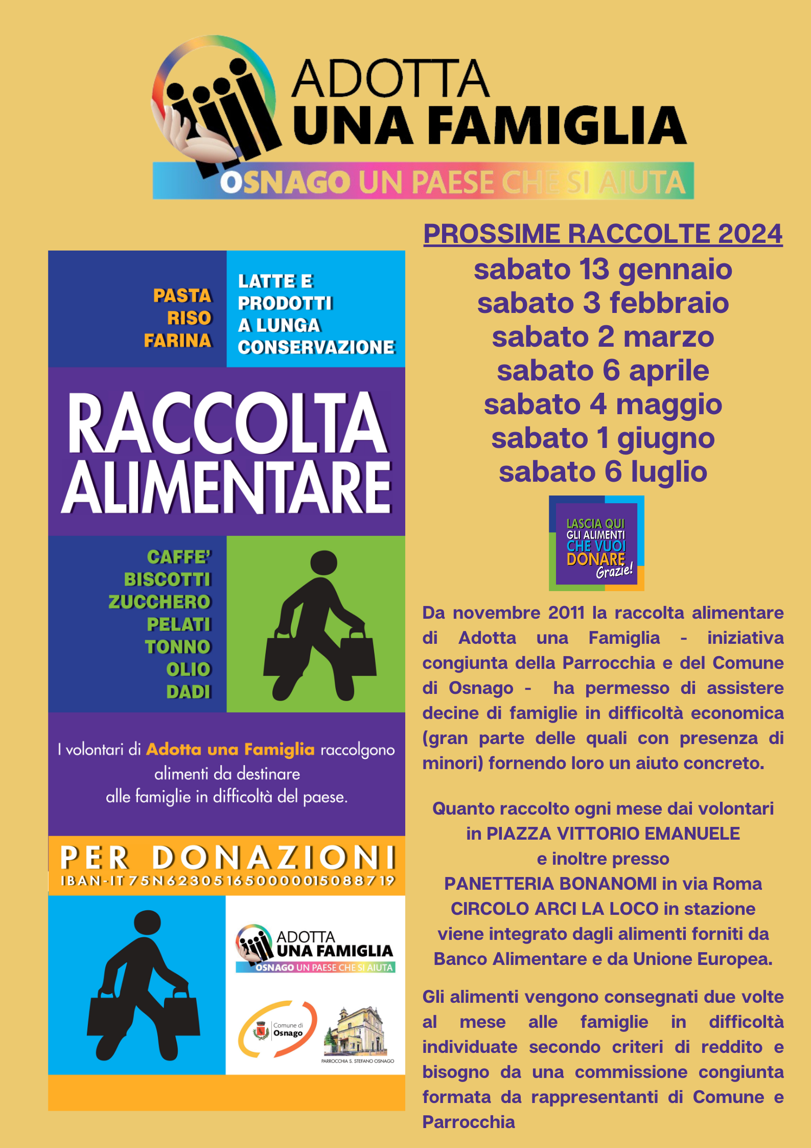 “Adotta una Famiglia” rappresenta un prezioso progetto congiunto del Comune e della Parrocchia di Osnago, attivo dal 2011, che non si limita alla distribuzione di alimenti, ma abbraccia varie forme di sostegno agli osnaghesi in difficoltà economica. Tra queste, vi sono l’erogazione di sussidi, l’iniziativa “Da studente a studente”, le borse sociali per l’attività sportiva e lo sportello “Collavoriamo” dedicato a chi cerca opportunità lavorative.