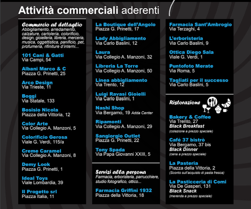 La proposta rappresenta una bella novità per il tessuto commerciale cittadino e ha visto l’adesione di una trentina di realtà commerciali meratese, distribuite tra il centro, viale Verdi e l’area commerciale di via Bergamo. A partecipare anche bar e ristoranti proponendo la formula del black breakfast, black lunch e black dinner con consumazioni e menù a tema e prezzo speciale pensate per arricchire l’offerta del weekend.