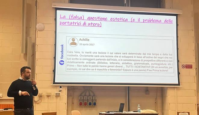 In Aula Magna il prof. Brigatti ha tenuto un interessante incontro dal titolo “E se fosse femminile?”, in cui ha affrontato la questione dell’utilizzo del femminile nei nomi di professione e del maschile sovraesteso; la riflessione, che ha preso le mosse dal testo di Vera Gheno “Femminile plurale”, è stata condotta anche attraverso la lettura di post Twitter (l’attuale “X”) e Facebook, che hanno messo in luce come l’azione apparentemente banale di scegliere una parola possa portare con sé stereotipi e pregiudizi; prendere consapevolezza delle implicazioni che l’uso della nostra lingua porta con sé è il primo passo per comunicare in modo equo e confrontarsi su questi temi è l’arma per trasmettere alle nuove generazioni il valore della parità di genere.