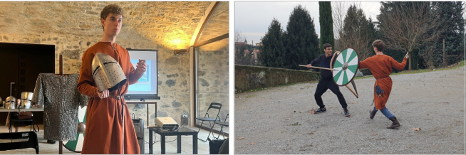 Le emozioni non sono poi mancate nel suggestivo scenario del Granaio inferiore di Villa Greppi, dove la giornata si è conclusa con un coinvolgente duello medievale. Protagonista è stato Giulio Galluzzi, praticante di scherma storica e appassionato della storia dei combattimenti e armamenti medioevali, che si è misurato in un confronto d’armi con uno dei partecipanti al suo corso. Galluzzi, infatti, in quanto esperto di storia militare del Medioevo, ha analizzato dal punto di vista tecnologico e storico come si armava un cavaliere, mostrando il suo equipaggiamento tramite materiale rievocativo: dallo scudo alla spada, dalla cotta di maglia all’elmo usate tra l’XI e il XVI secolo, sfatando il mito del cavaliere “senza macchia e senza paura”. Ogni sfaccettatura di una spada, dalla lama all’impugnatura, è stata presentata come frutto del lavoro e del pensiero di straordinari artigiani, che hanno prodotto armature la cui complessità tecnica resta, ancora oggi, di difficile imitazione.