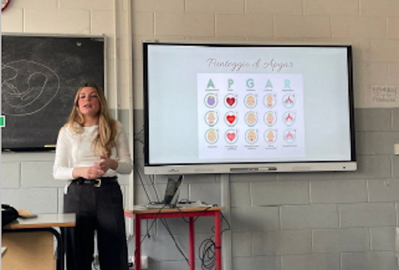 Innanzitutto, abbiamo avuto la fortuna di accogliere molti ospiti, tra cui la giovane dottoressa in ostetricia Aurora Lungarno, ex alunna “villagreppina” del Liceo delle Scienze Umane. Aurora ha tenuto una lezione informativa sulle principali patologie dei neonati: cardiache, polmonari, gastrointestinali e neurologiche. In seguito, ha spiegato come si possa capire, appena avvenuto il parto, se il bambino stia bene. Questa valutazione si basa sulla Scala di Apgar, un sistema utilizzato per misurare la vitalità e le condizioni di salute del neonato nei primi minuti di vita. “Fare l’ostetrica è sempre stato il mio sogno: vedere la vita nascere ogni giorno è per me la cosa più bella”: queste sono le commoventi parole pronunciate da Aurora, durante la breve intervista rilasciata a fine incontro.