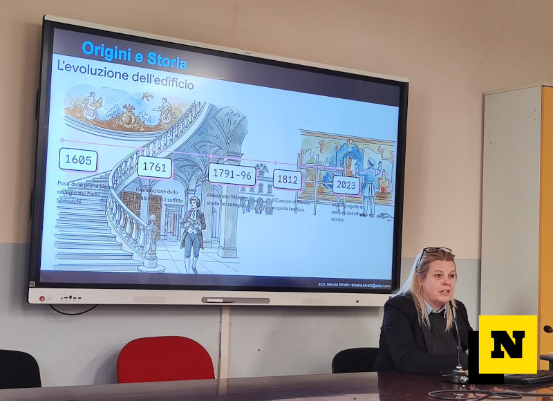 E’ stata proprio l’architetto Silvetti a illustrare, con l’ausilio di alcune slides, pensate in primis per gli studenti, fruitori principali dell’opera, l’importante lavoro svolto, andato ben oltre la semplice pulizia di un affresco. Due le sovrintendenze coinvolte nel progetto che ha riguardato sia gli aspetti pittorici e decorativi (per la competenza della dottoressa Olivetti), sia quelli legati ai beni architettonici con lo scalone e la balaustra (di competenza prima di Sintini e ora di Robbiati).