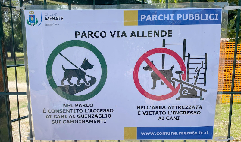 MERATE – Sì al passaggio, rigorosamente al guinzaglio, lungo i camminamenti; no all’avvicinamento all’area attrezzata per la pratica del calisthenics. E’ quanto ha deciso l’amministrazione comunale guidata dal sindaco Mattia Salvioni disciplinando in questo modo l’accesso all’area verde sportiva di via Allende. Una scelta comunicata già in occasione del Consiglio comunale di inizio giugno e concretizzata con dei nuovi cartelli esemplificativi posti all’ingresso del parco.