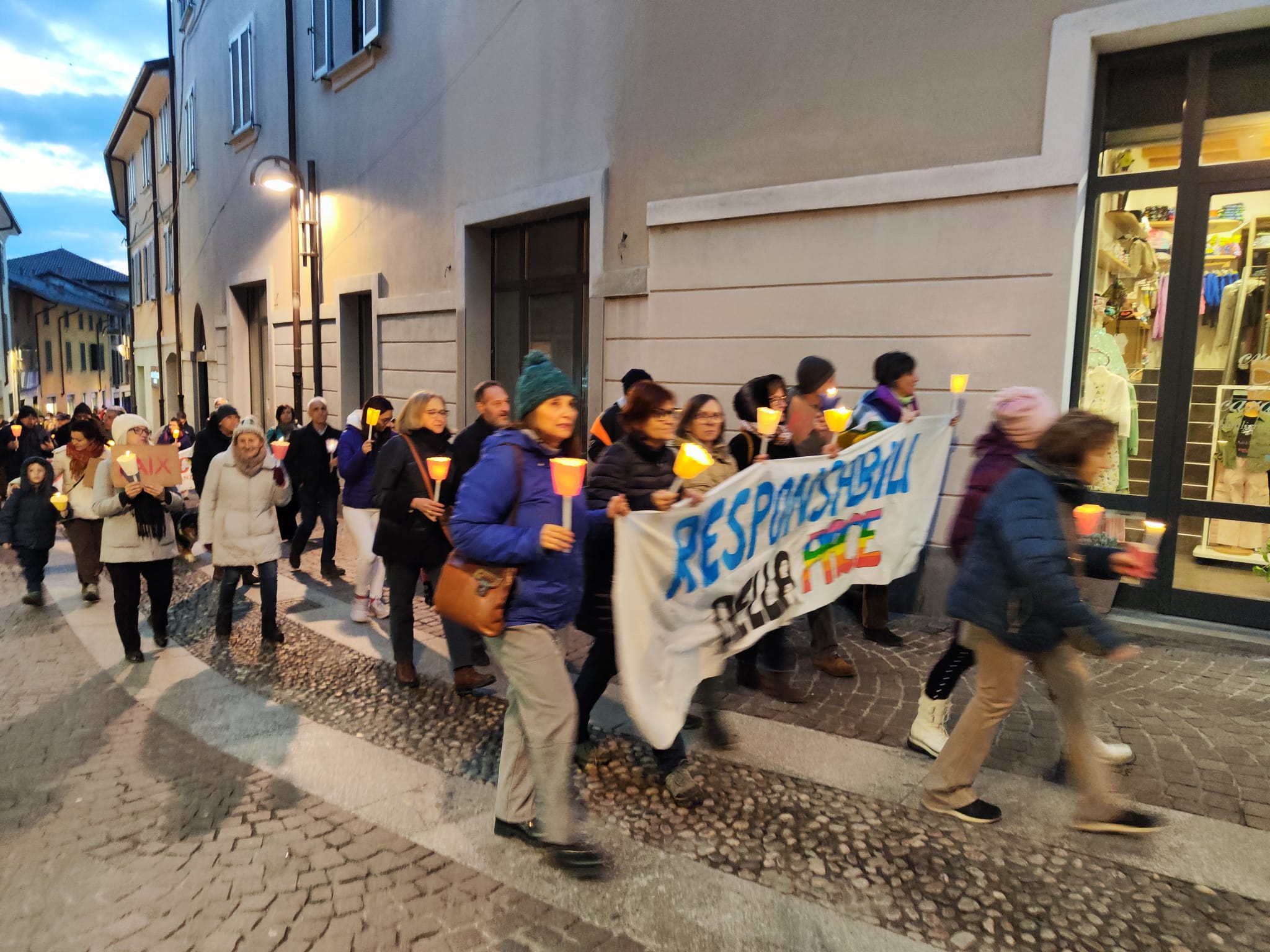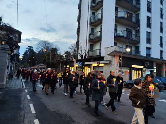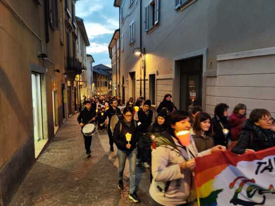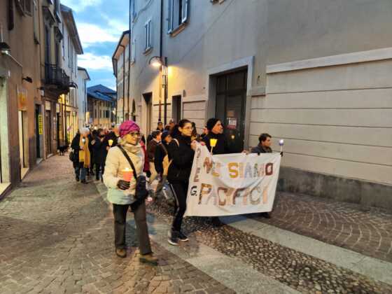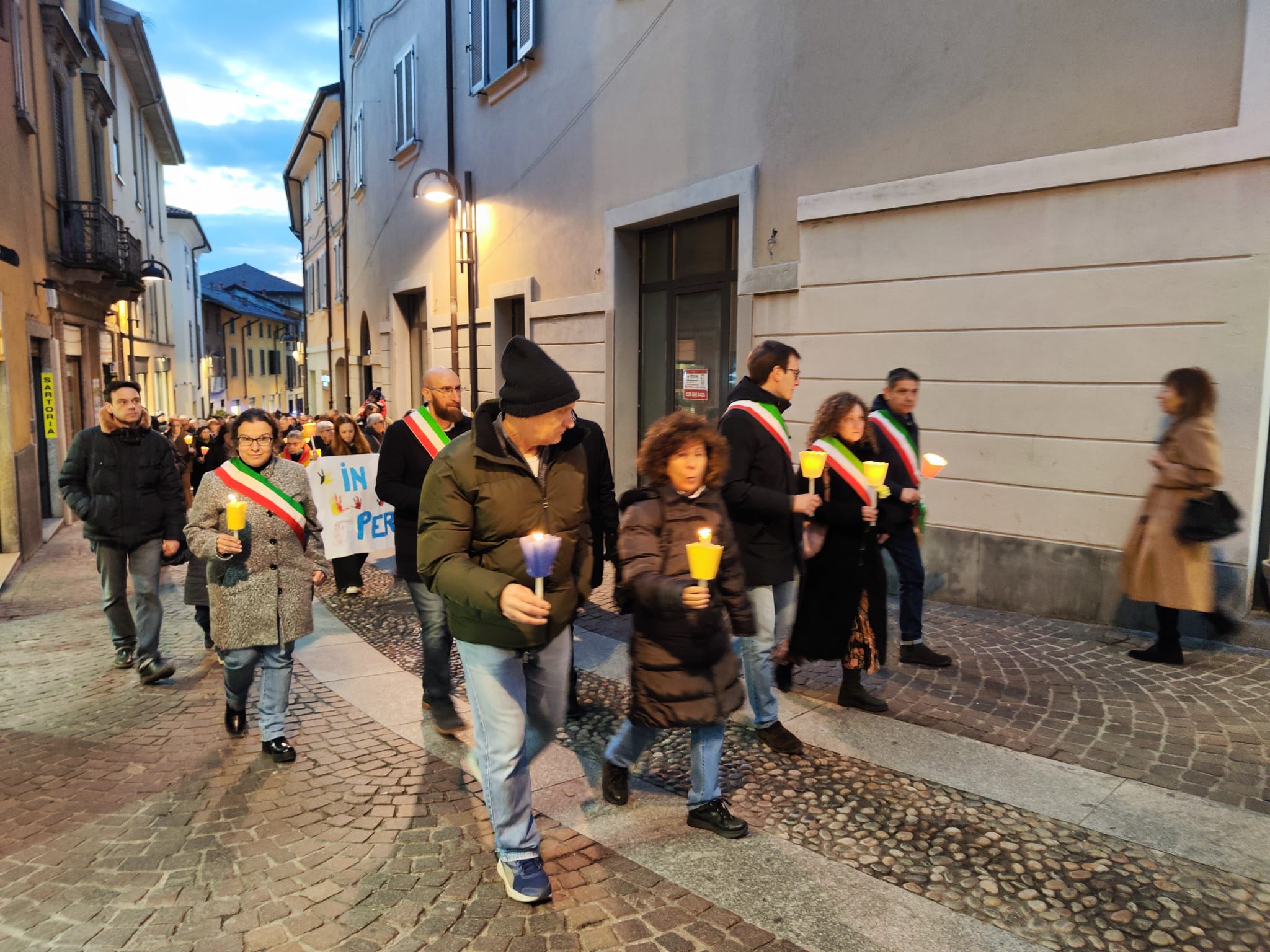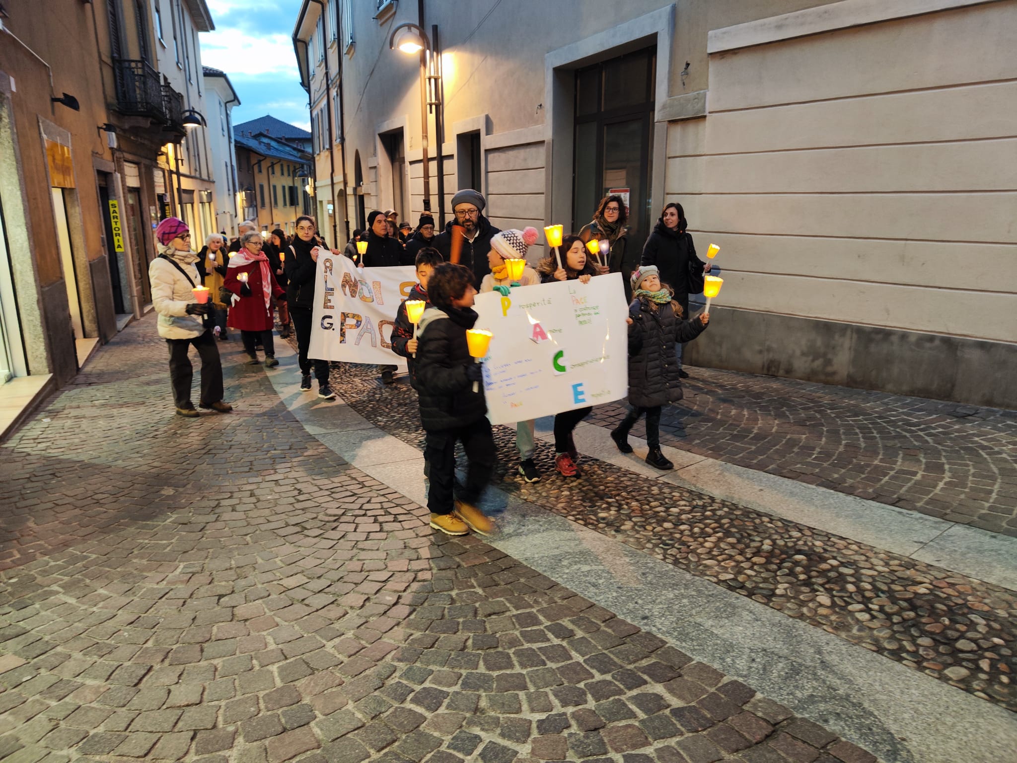 Le parole hanno poi lasciato il posto alla luce delle fiaccole accese una dopo l’altra con il corteo, aperto dallo striscione “Sì alla pace, no al riarmo”, che si è incamminato lungo via Garibaldi e via Manzoni per arrivare sotto la Torre, dove si è svolto il primo momento di riflessione. Dopodichè il corteo ha ripreso a marciare verso via Trento per tornare in piazza Prinetti da piazza degli Eroi.