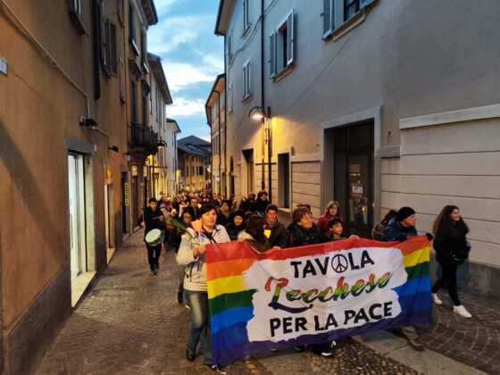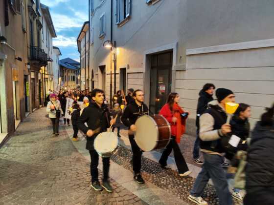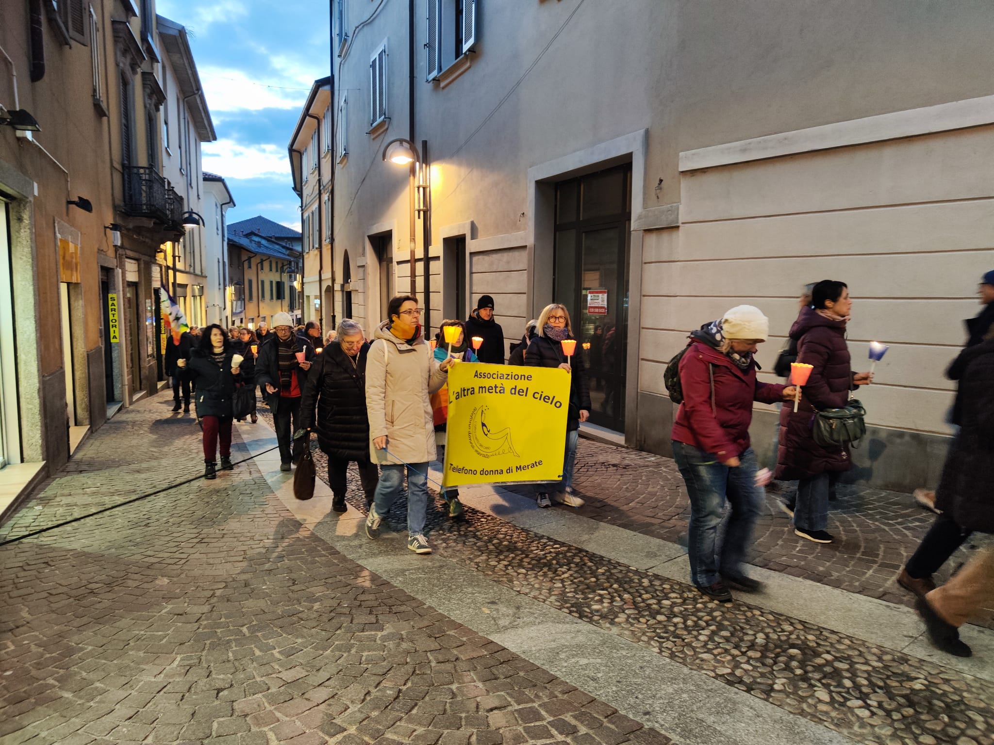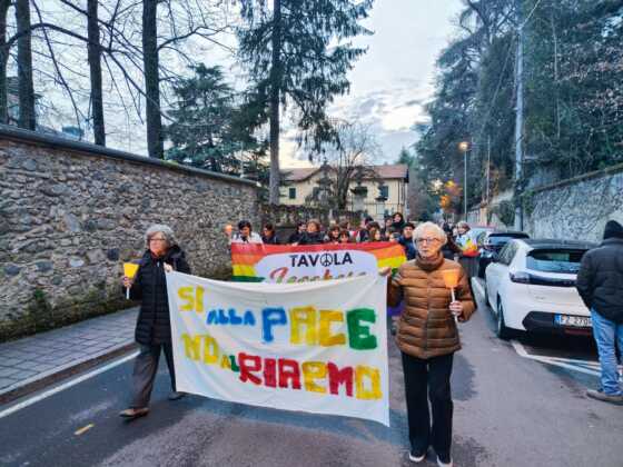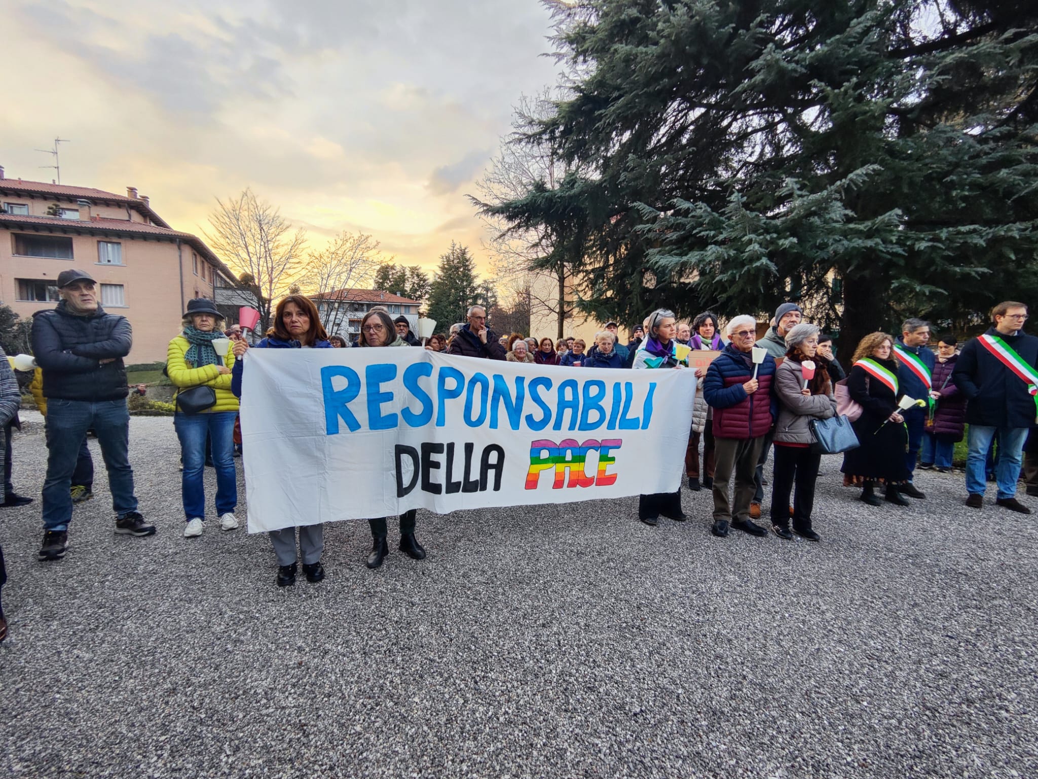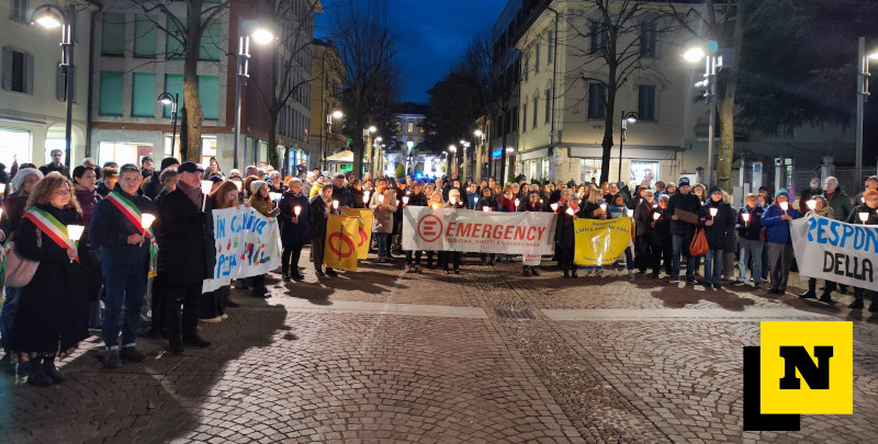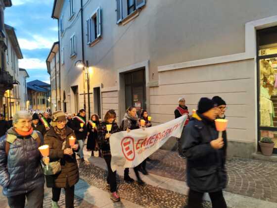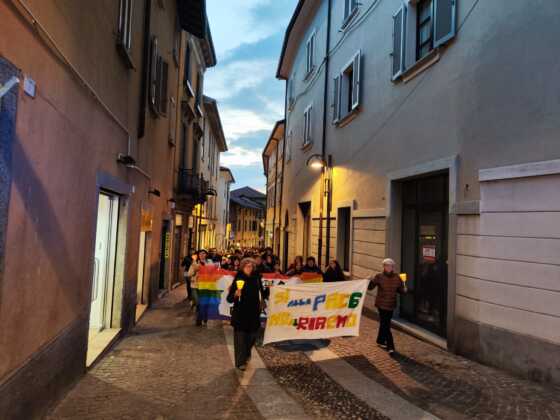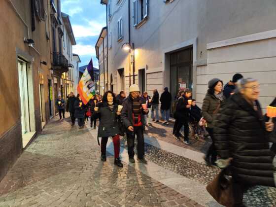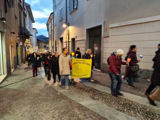 Le parole hanno poi lasciato il posto alla luce delle fiaccole accese una dopo l’altra con il corteo, aperto dallo striscione “Sì alla pace, no al riarmo”, che si è incamminato lungo via Garibaldi e via Manzoni per arrivare sotto la Torre, dove si è svolto il primo momento di riflessione. Dopodichè il corteo ha ripreso a marciare verso via Trento per tornare in piazza Prinetti da piazza degli Eroi.