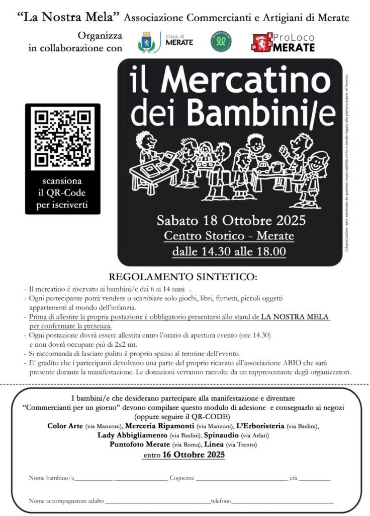 MERATE – Torna il mercatino dei bambini in piazza. L’appuntamento è per sabato 18 ottobre dalle 14.30 alle 18.30 sotto la Torre del Castello Prinetti. L’iniziativa porta la firma dell’associazione La Nostra Mela, grazie all’impegno profuso dal presidente Andrea Valtorta e del consigliere Carlo Porro.