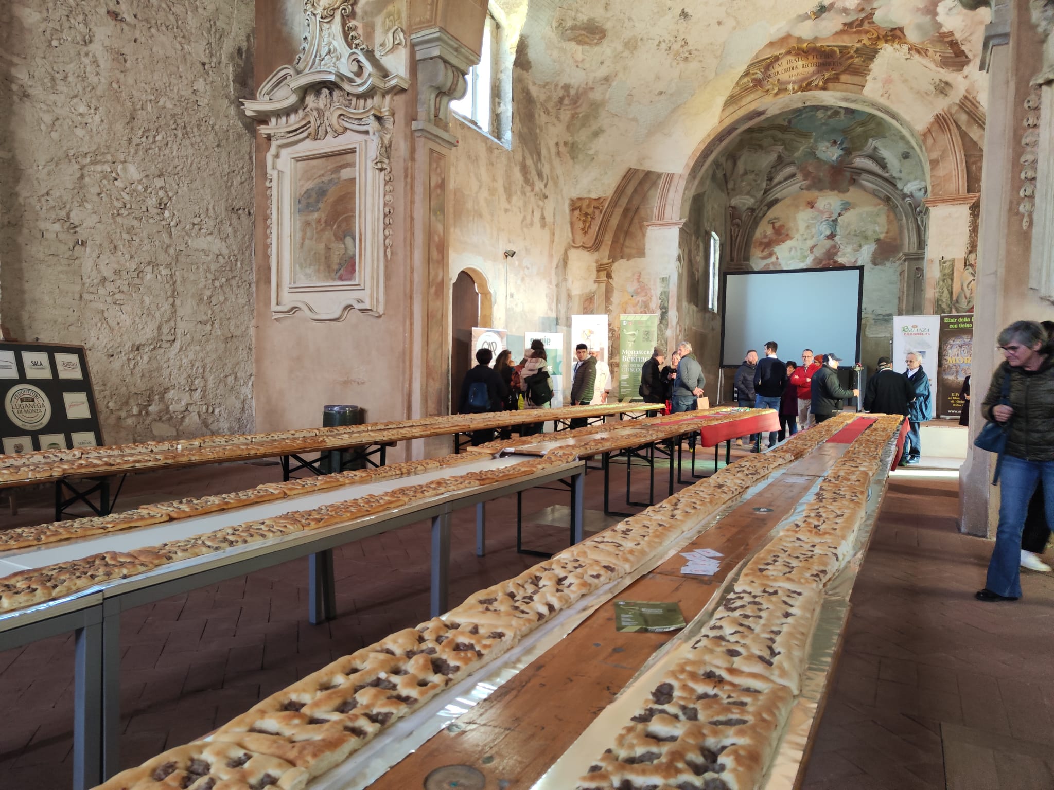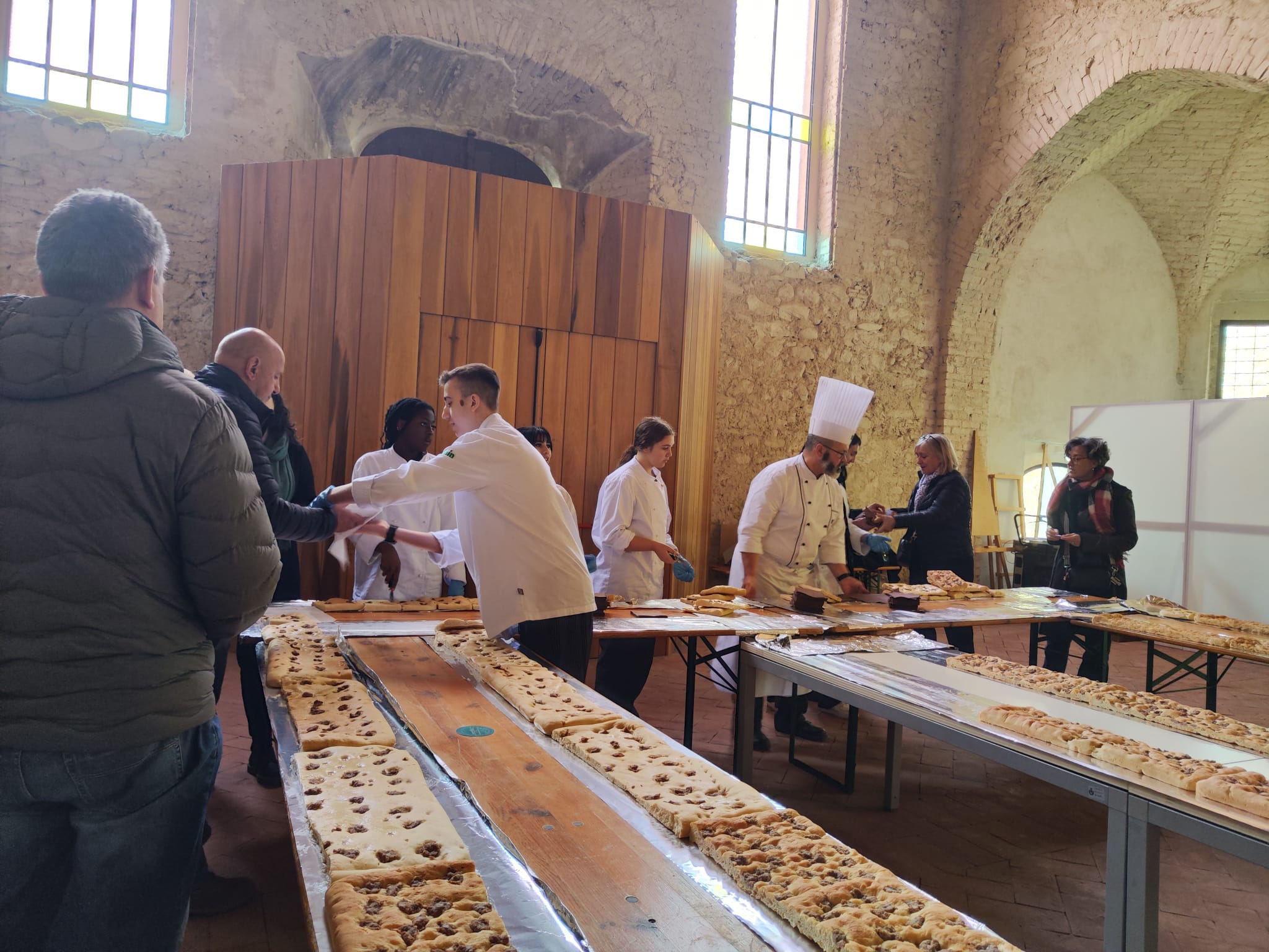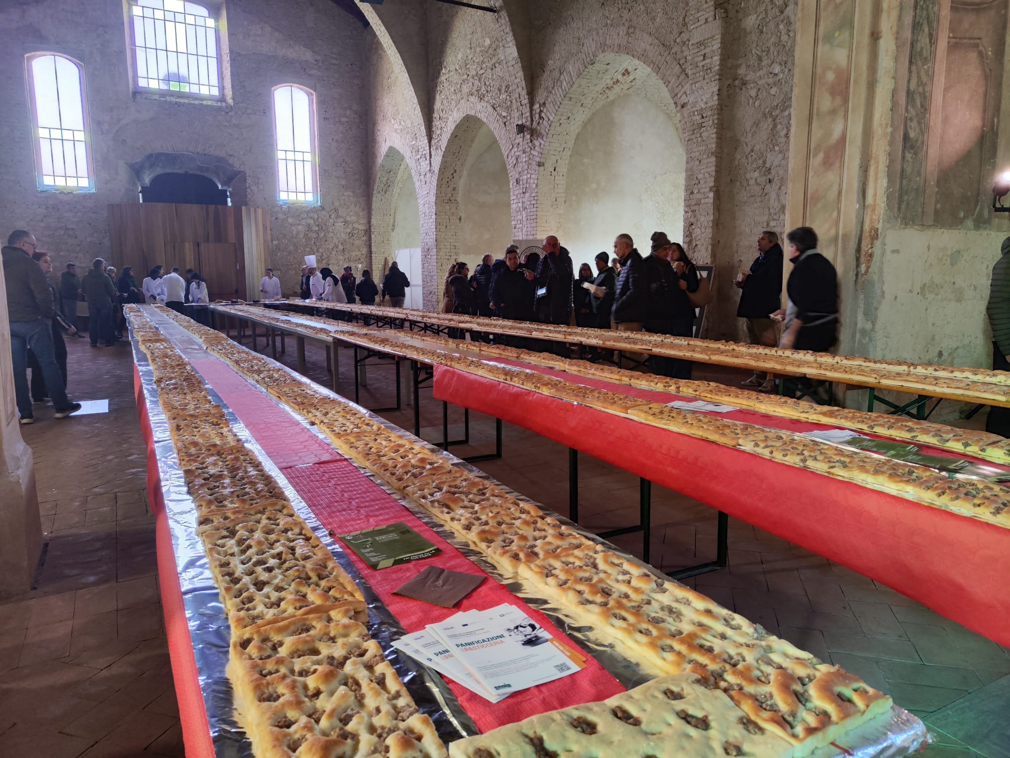La focaccia è stata realizzata da una decina di panettieri della Brianza con il coinvolgimento della scuola di panetteria e pasticceria dell’Enaip di Lecco