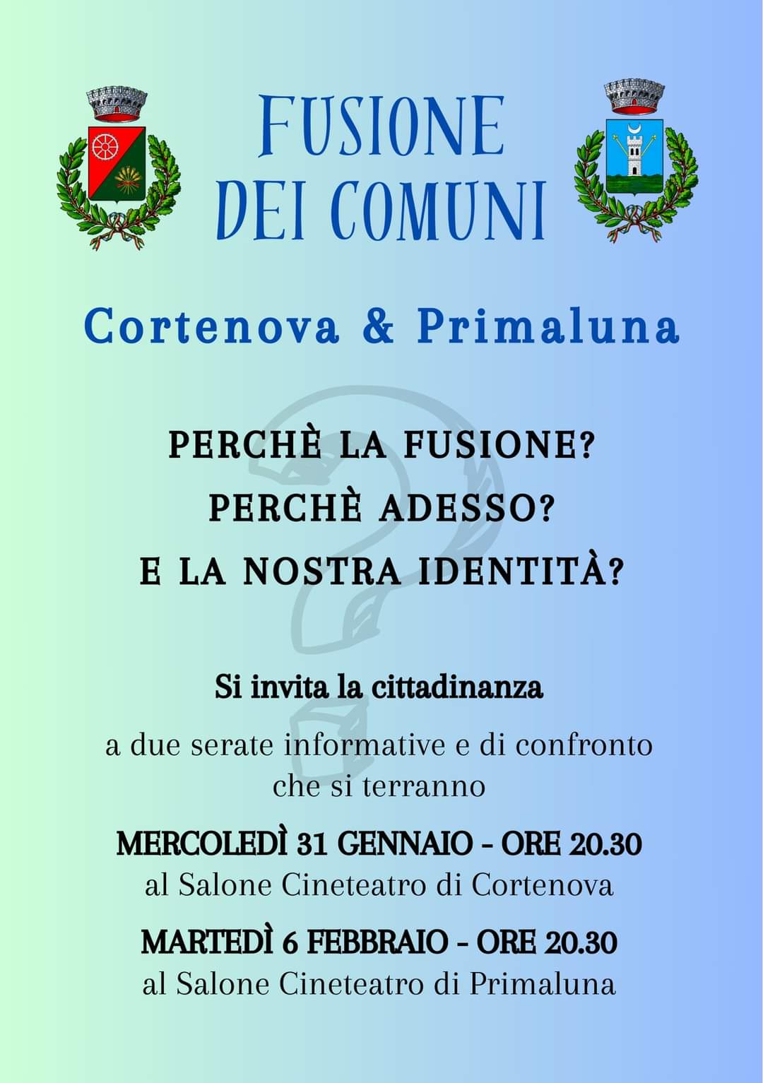CORTENOVA – Gli Amministratori dei paesi di Cortenova e Primaluna incontrano i cittadini per un confronto pubblico riguardo la scelta di fondere i due Comuni. La prima serata informativa si terrà mercoledì 31 gennaio alle 20:30 presso il salone del cineteatro di Cortenova.