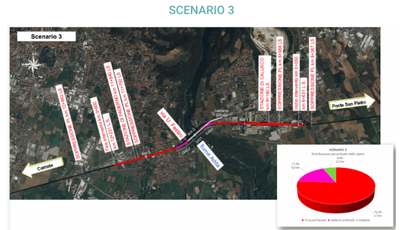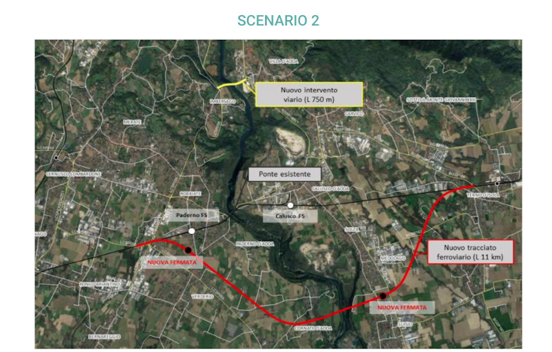 Rispetto allo Scenario 1, l’ipotesi strutturale per il ponte ferroviario dello Scenario 3, non prevede quindi il canale viario. Relativamente al collegamento viario tra Calusco e Paderno, si prevede una soluzione di scavalco del fiume Adda posta a Nord rispetto al tracciato ferroviario.