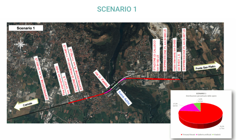 Lo scenario 1 prevede la realizzazione di un’unica opera di scavalco del Fiume Adda in affiancamento a quello esistente che ospita la viabilità alla quota superiore e la ferrovia a quella inferiore (assetto come l’attuale).