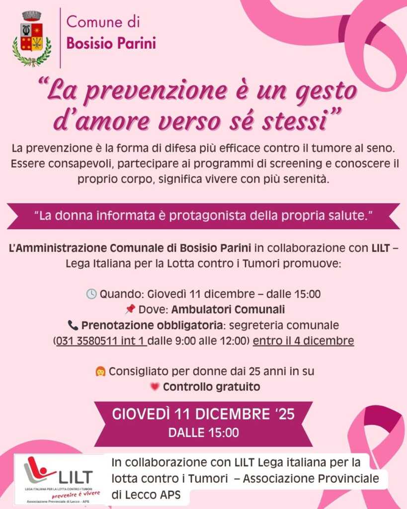 BOSISIO PARINI – “La prevenzione è un gesto d’amore verso se stessi e le persone che amiamo”. L’Assessore alle Politiche Sociali di Bosisio Parini, Francesca Faranda, vuole sottolineare quanto l’attenzione ad ascoltare il nostro corpo insieme a tutti i programmi di prevenzione presenti sul territorio, possono fare la differenza nella diagnosi precoce di molte malattie , portando a guarigione quelle che in passato erano definite “malattie incurabili”.