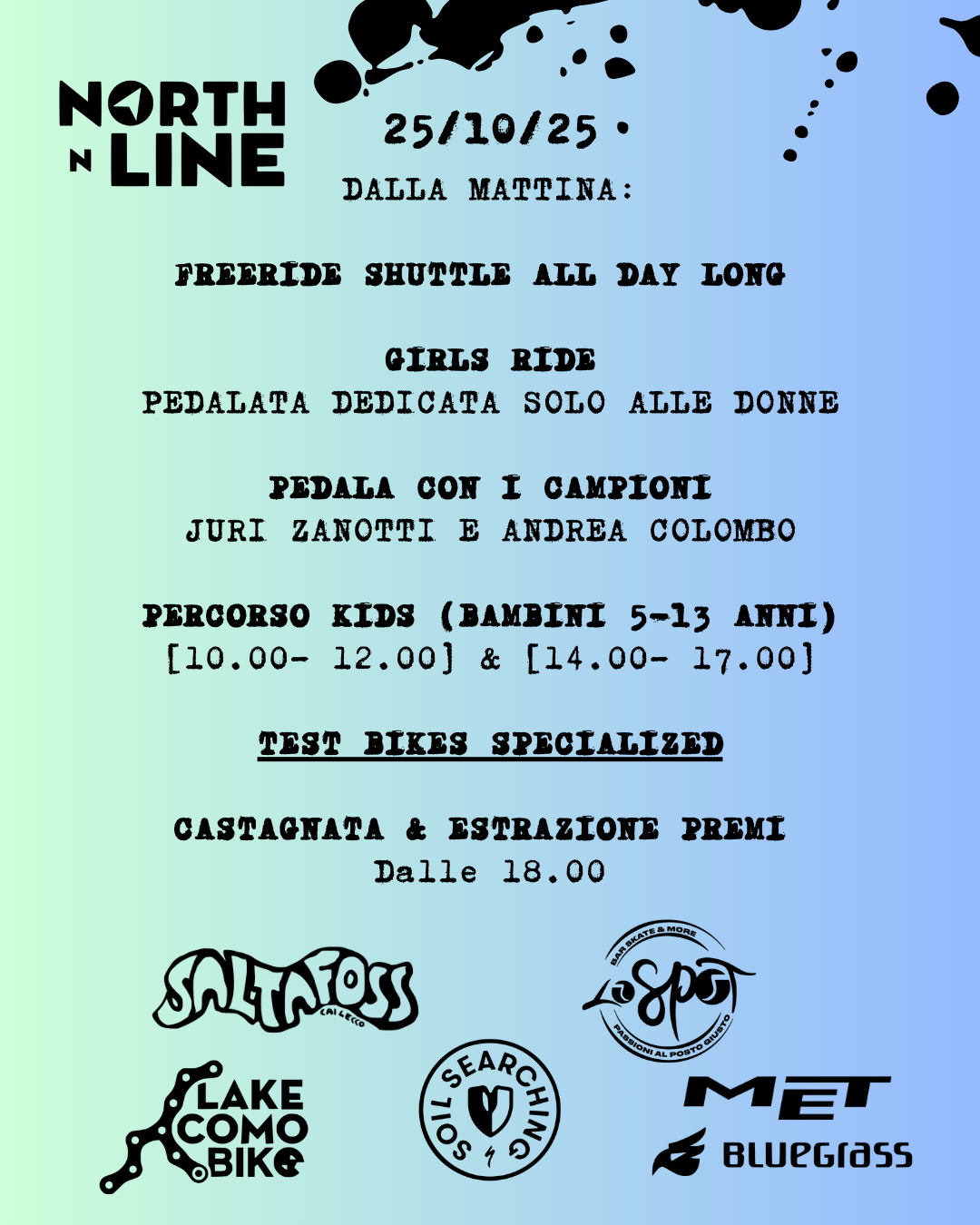 L’evento è realizzato in collaborazione con North N Line ASD, Lo Spot, Vibes ASD e Lake Como Bike Shop, con il supporto degli sponsor Met, Bluegrass e Specialized Soil Searching
