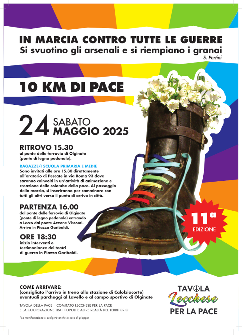 LECCO – Una camminata di 10 km per ribadire la necessità del cessate il fuoco in Ucraina, in Palestina e in tutti gli altri contesti di guerra. Dopo la grande partecipazione registrata negli ultimi anni, sabato 24 maggio 2025 la Tavola Lecchese per la Pace organizza nuovamente la Marcia della Pace da Olginate a Lecco, con ritrovo fissato alle ore 15.30 al ponte della ferrovia di Olginate, partenza alle ore 16 e arrivo in Piazza Garibaldi a Lecco, dove alle 18.30 sono previsti gli interventi conclusivi. Si consiglia ai partecipanti l’arrivo in treno alla stazione di Calolziocorte; eventuali parcheggi per le auto sono disponibili nell’area del Lavello a Calolziocorte e nei pressi del campo sportivo di Olginate.