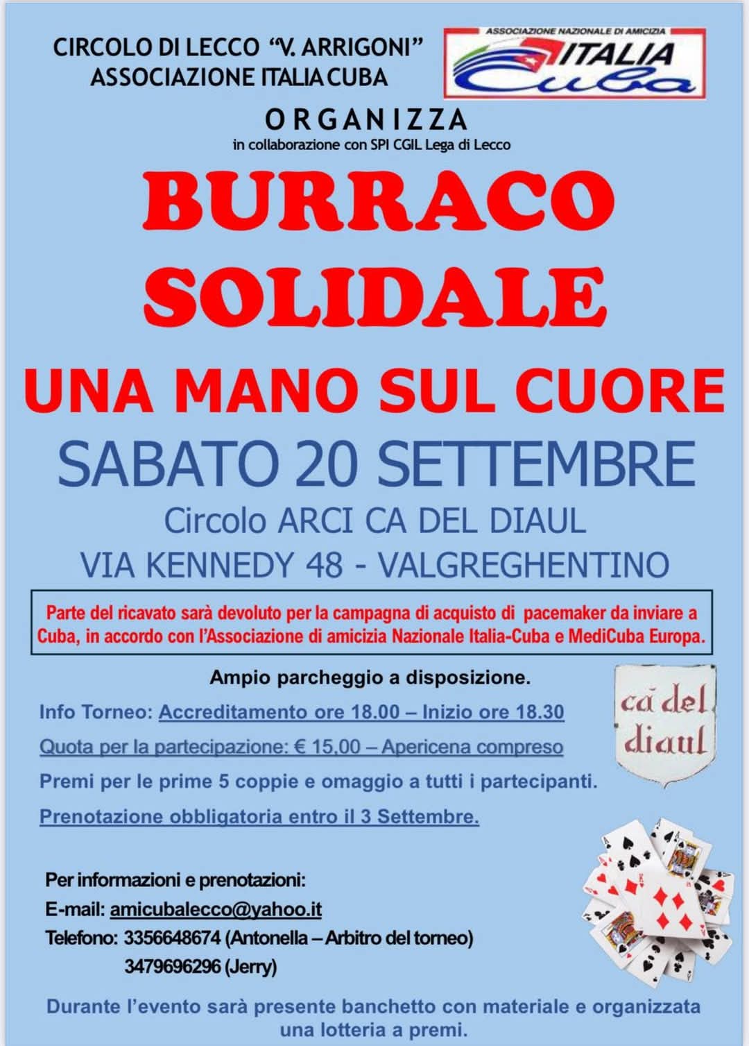 VALGREGHENTINO – Il Circolo di Lecco “V. Arrigoni” dell’Associazione Italia-Cuba, in collaborazione con SPI CGIL Lega di Lecco, organizza un evento speciale all’insegna del gioco e della solidarietà: il torneo di Burraco solidale “Una mano sul cuore”, in programma sabato 20 settembre presso il Circolo ARCI Ca del Diaul, in via Kennedy 48 a Valgreghentino.
