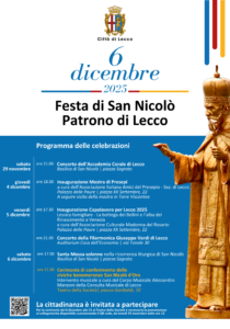 LECCO – Anche quest’anno il Comune di Lecco celebra San Nicolò, patrono della città, con un ricco calendario di eventi che culminerà nella cerimonia di conferimento delle civiche benemerenze, in programma sabato 6 dicembre alle 21 al Teatro della Società in piazza Garibaldi.