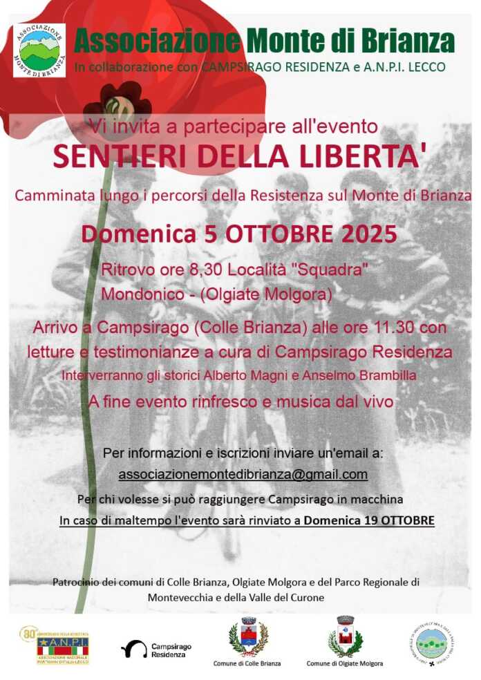 OLGIATE MOLGORA – Domenica 5 ottobre, l’associazione Monte di Brianza propone la passeggiata lungo i “Sentieri della libertà”, un itinerario che attraversa i luoghi della Resistenza sul Monte di Brianza. L’iniziativa si svolge in collaborazione con Campsirago Residenza e ANPI Lecco, con il patrocinio dei comuni di Colle Brianza, Olgiate Molgora e del Parco di Montevecchia e della Valle del Curone.