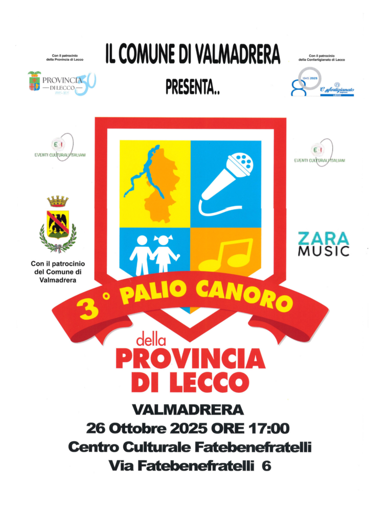 VALMADRERA – Torna anche quest’anno il Palio Canoro della Provincia di Lecco, la manifestazione musicale dedicata ai giovani talenti delle scuole primarie del territorio. Dopo il successo delle prime due edizioni, il concorso – ideato e organizzato dall’Associazione Eventi Culturali Italiani di Sirone – giunge alla sua terza edizione e farà tappa a Valmadrera domenica 26 ottobre 2025 alle ore 17.00, presso l’Auditorium del Centro Culturale Fatebenefratelli.