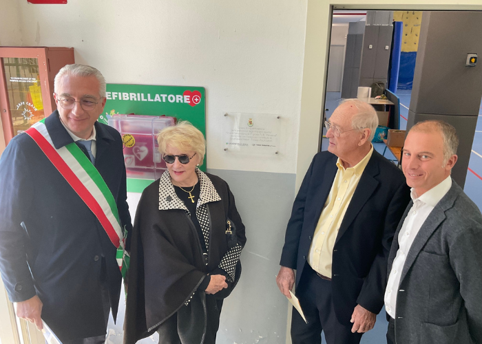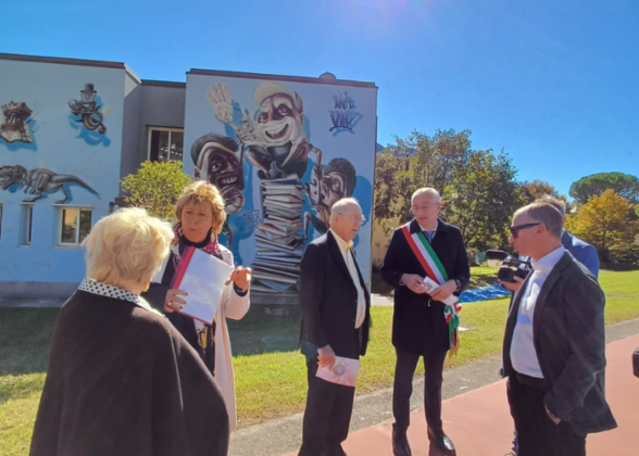 Un nutrito gruppo di alunni e insegnanti ha accolto i coniugi Timken presso la palestra della Scuola Secondaria di Primo Grado e successivamente al campo sportivo all’aperto, due strutture rinnovate grazie al contributo della Fondazione.