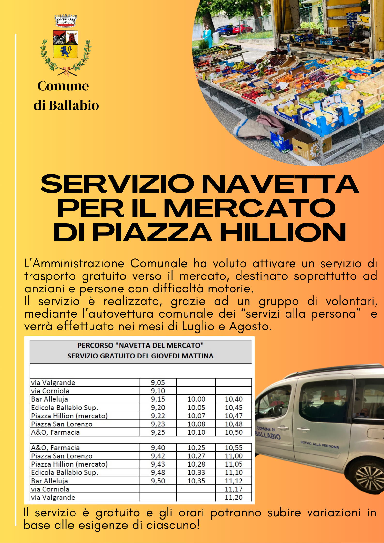 A partire dalle ore 09.05 e fino alle ore 11.20 la navetta effettuerà un percorso a ripetizione che collegherà la zona di Ballabio Superiore alla piazza del mercato con anche un passaggio alla farmacia.