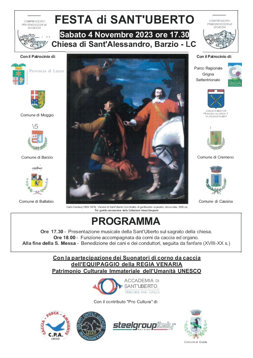 La prima celebrazione del culto di Sant’Uberto nel lecchese con associazione Caccia Pesca Ambiente di Lecco, con il Comprensorio Alpino di Caccia delle Prealpi Lecchesi e il Gruppo Cinofilo