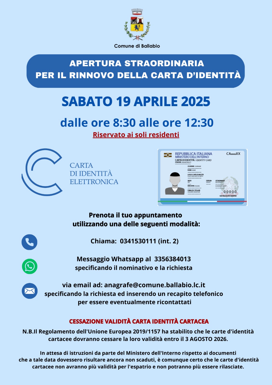 BALLABIO – Apertura straordinaria dell’Ufficio Anagrafe del Comune di Ballabio, la mattina di Sabato 19 Aprile con l’obiettivo di agevolare i residenti ballabiesi nel rinnovo della Carta d’Identità Elettronica. Per prenotare un appuntamento è possibile telefonare al 0341.530111 (interno 2), inviare una mail a anagrafe@comune.ballabio.lc.it oppure inviando, semplicemente, un messaggio Whatsapp al numero dedicato 335.6834013.
