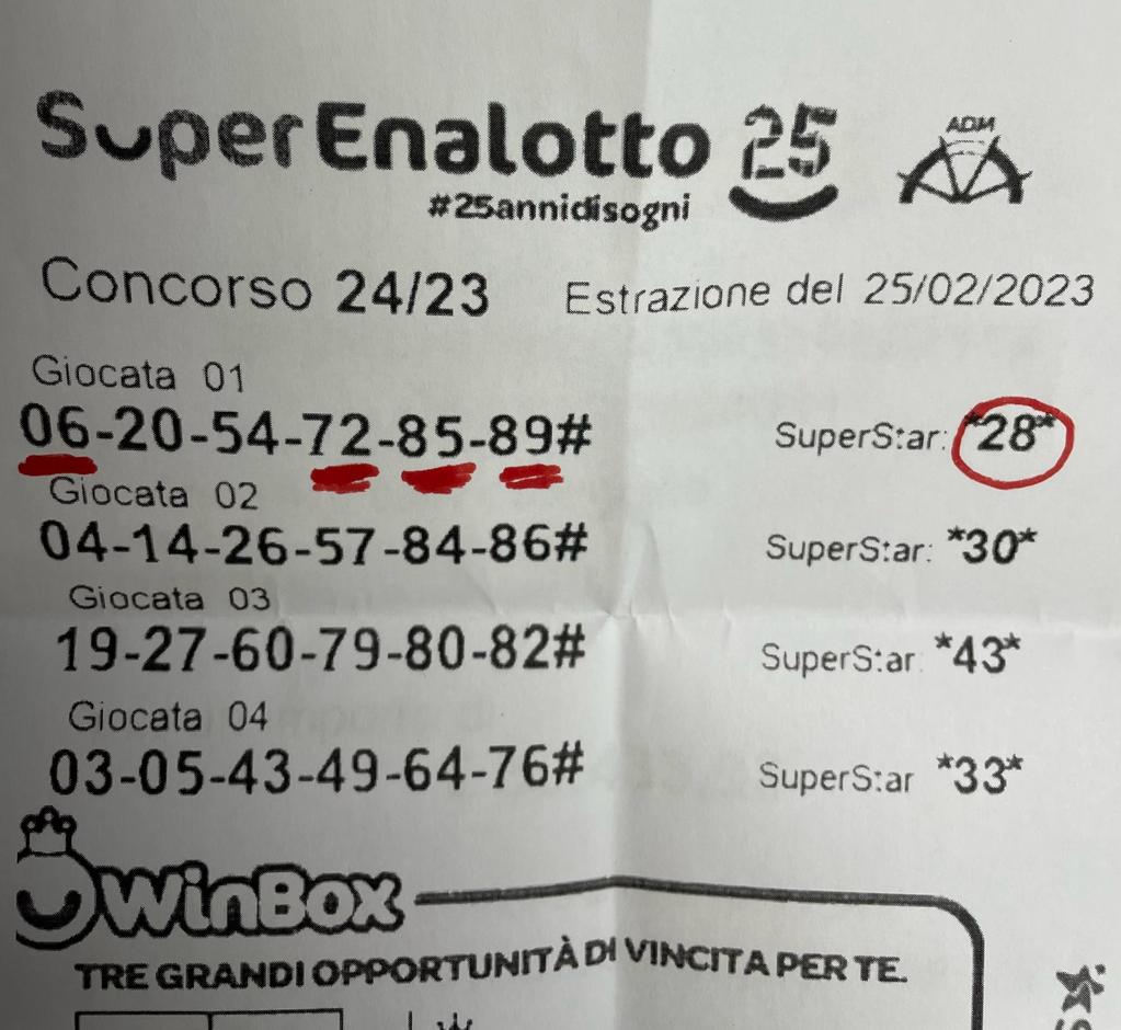 “Siamo tutti contenti per la vincita – spiega Maurizio – Il fortunato è un pensionato del paese che gioca in maniera occasionale. Sabato scorso nel giorno del suo compleanno ha voluto tentare la fortuna ed è stato premiato cogliendo un 4 + jolly, riscuotendo ben 30.433,93 euro con i numeri: 6-72-85-89 e numero jolly Super Star 28. Oggi è venuto in ricevitoria con il tagliando con la vincita che è stata confermata”.