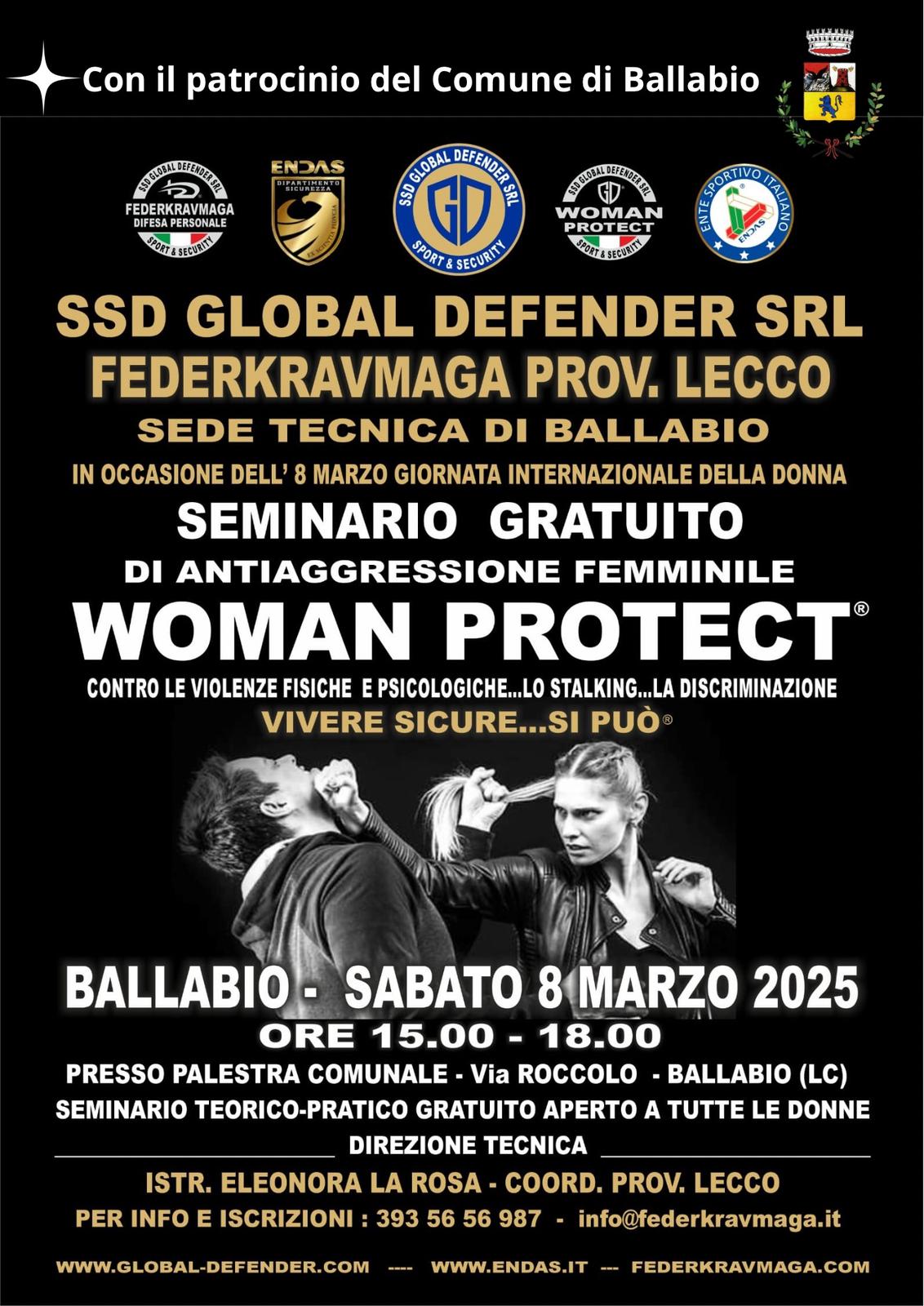 BALLABIO – In occasione della Giornata internazionale della donna il Comune di Ballabio, tra le varie iniziative, ha deciso di patrocinare un seminario di autodifesa e antiaggressione femminile. Il seminario sarà gratuito e tenuto dalla ballabiese Eleonora La Rosa, istruttrice e coordinatrice provinciale di Federkravmaga Italia. L’appuntamento è in programma per sabato 8 marzo 2025 dalle ore 15 alle ore 18 presso la palestra comunale di Ballabio.