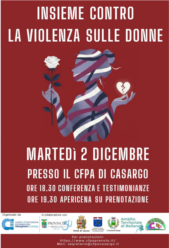 CASARGO – Un’iniziativa dedicata al contrasto della violenza di genere sarà ospitata presso il CFPA di Casargo, che martedì 2 dicembre propone un momento pubblico di sensibilizzazione dal titolo “Insieme contro la violenza sulle donne”. L’appuntamento prevede alle 18.30 una conferenza con testimonianze, seguita alle 19.30 da un’apericena su prenotazione.