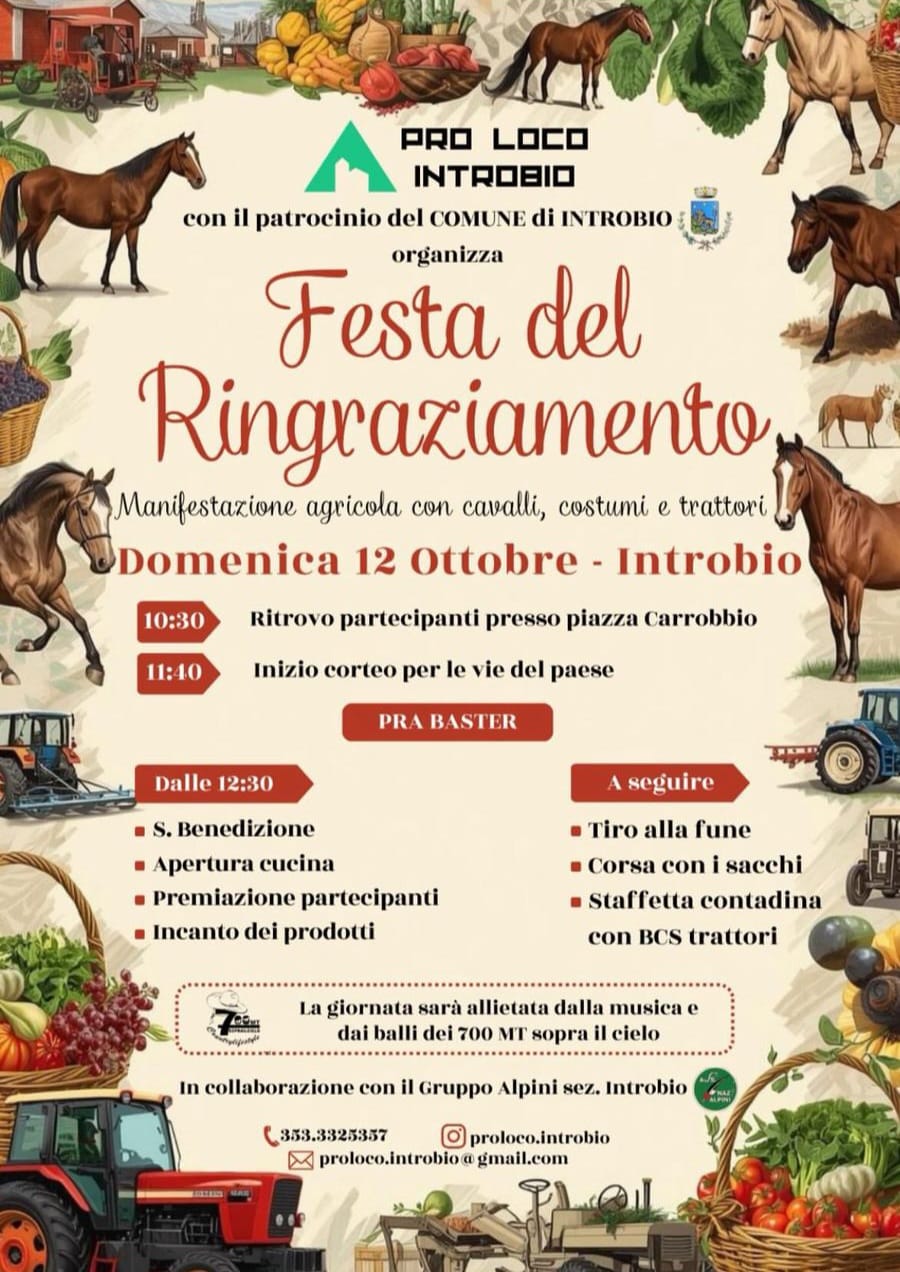 La giornata sarà allietata dalla musica e dai balli dei “700 MT sopra il cielo”. La festa del Ringraziamento è organizzata dalla Pro Loco Introbio in collaborazione con il Gruppo Alpini e patrocinata dal Comune.
