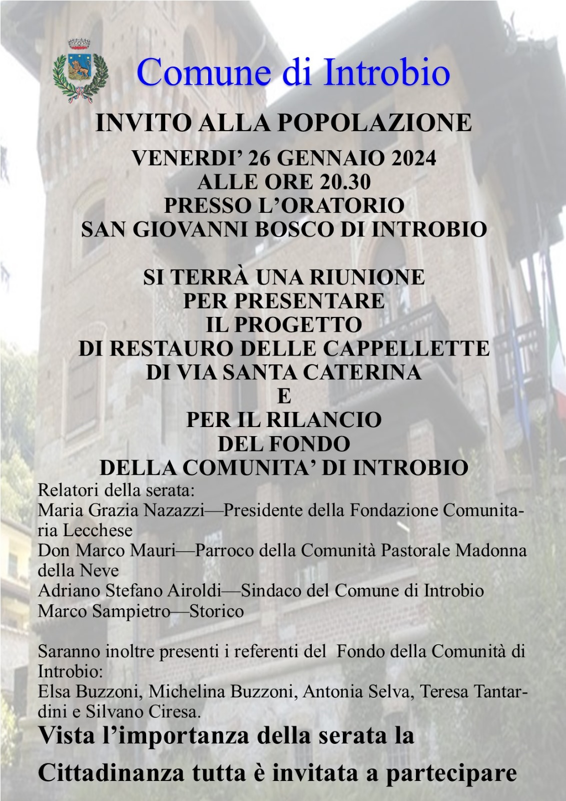 INTROBIO – L’Amministrazione comunale invita tutta la popolazione a partecipare all’incontro pubblico fissato per venerdì sera, 26 gennaio, alle 20.30 presso il salone dell’oratorio San Giovanni Bosco.