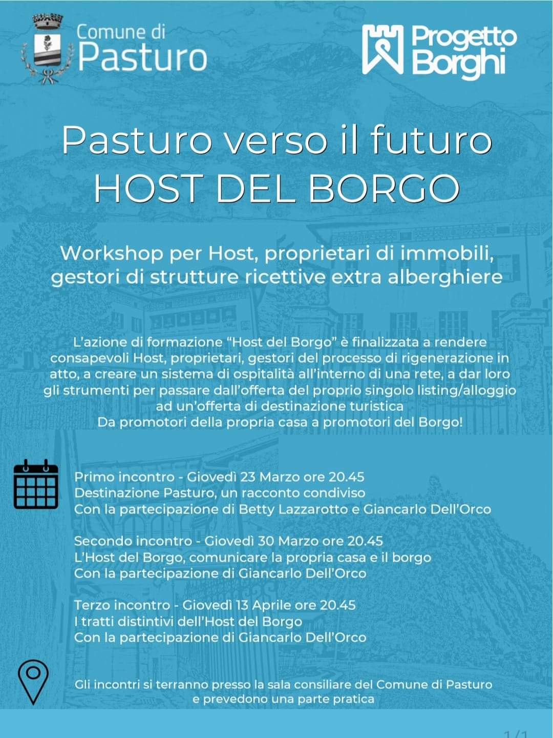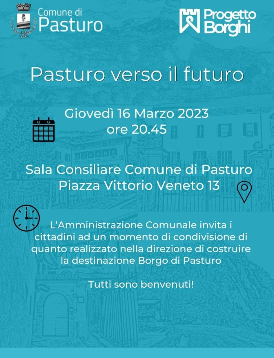 PASTURO – L’amministrazione comunale guarda al futuro per la valorizzazione del proprio paese e l’incentivo dell’ospitalità turistica. Per farlo lancia il “Progetto Borghi” e invita la cittadinanza a partecipare a una serata in cui verrà presentata l’iniziativa e il percorso intrapreso dal Comune di Pasturo.