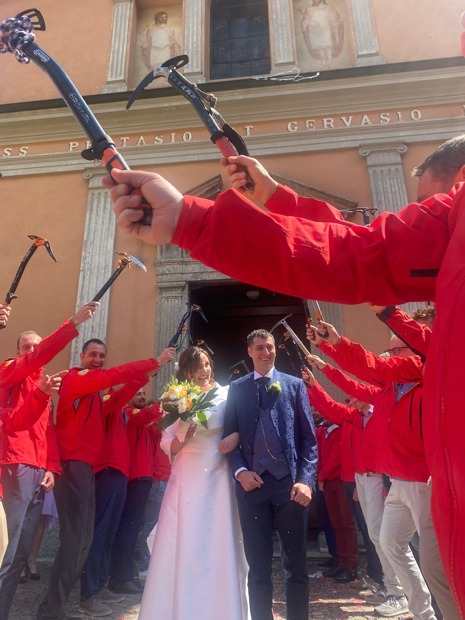 CORTENOVA – Piccozze in alto a formare un suggestivo tunnel all’uscita della chiesa di Cortenova tra applausi, coriandoli e riso. Così sono stati accolti sul sagrato, subito dopo il fatidico “sì”, Sergio Uberti, capo squadra di Barzio del Soccorso Alpino, Stazione Valsassina e Valvarrone e Valeria Merlo, giovane medico di Pasturo convolati a nozze sabato.