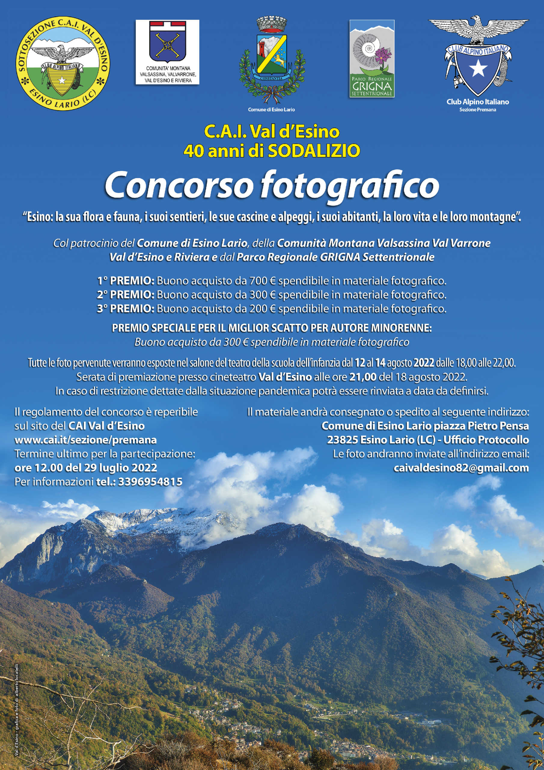 “Esino: la sua flora e fauna, i suoi sentieri, le sue cascine e alpeggi, i suoi abitanti, la loro vita e le loro montagne” è questo è il tema del concorso fotografico organizzato in occasione del quarantennale, che gode del patrocinio del Comune di Esino Lario, della Comunità Montana Valsassina Val Varrone, Val d’Esino e Riviera e del Parco Regionale Grigna Settentrionale.