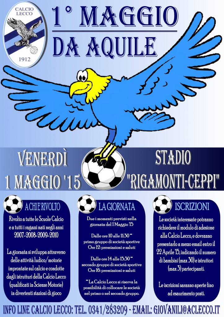 1 maggio da aquileLECCO – Venerdì primo maggio, al Rigamonti Ceppi la Calcio Lecco organizza “1° Maggio da Aquile”, manifestazione rivolta alle scuole calcio e a tutti i bambini e bambine delle annate 2007-2008-2009-2010.