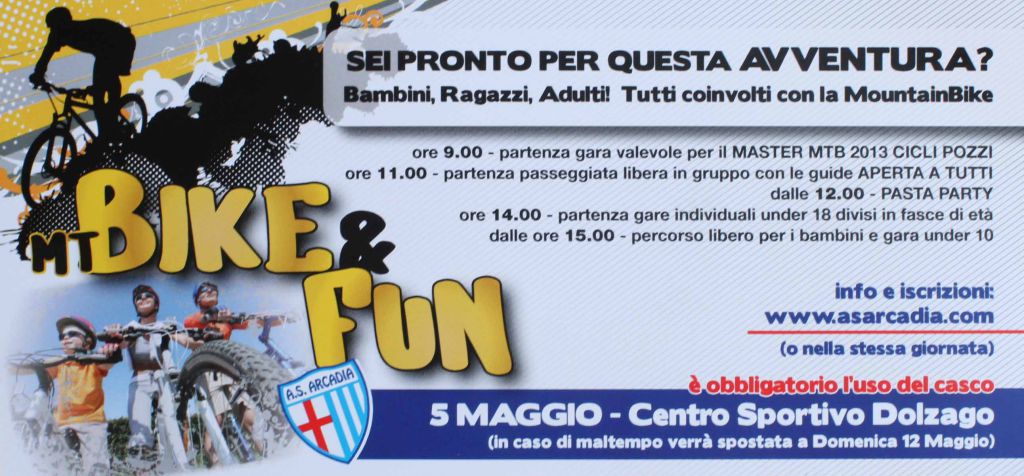 DOLZAGO – L’Associazione Sportiva Arcadia organizza per domenica 5 maggio la terza edizione della MTBike&Fun. La manifestazione in mountain bike si svolgerà presso il Centro Sportivo di Dolzago e, in caso di maltempo, sarà rinviata a domenica 12 maggio. L’invito a partecipare è rivolto a bambini, ragazzi e adulti.