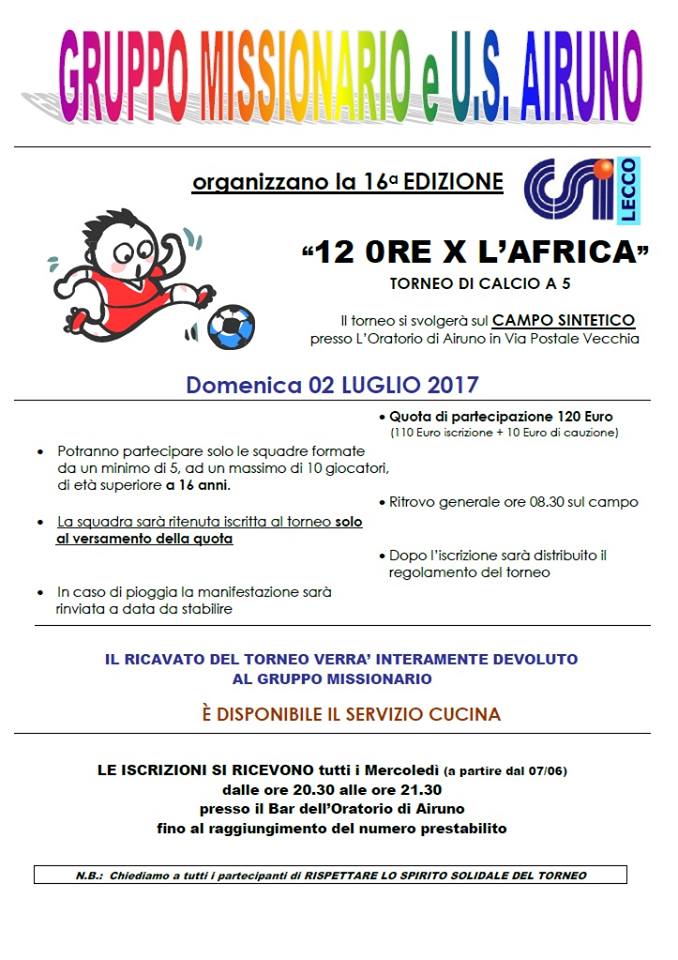 Si proseguirà domenica 2 luglio con “16° edizione 12 ore per l’Africa” (QUI la locandina), torneo di calcio a 5 su campo sintetico organizzato da Unione Sportiva e Gruppo Missionario.