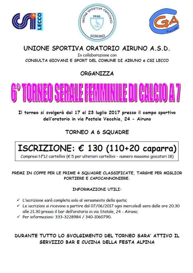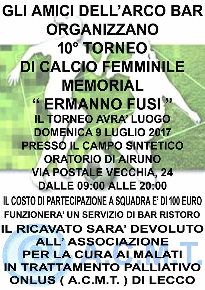 Sempre domenica 9 luglio si svolgerà la “10° edizione torneo di calcio femminile memorial Ermanno Fusi” (QUI la locandina), organizzato dagli amici dell’ Arco bar di Lecco per raccogliere fondi per l’associazione per la cura ai malati in trattamento palliativo onlus di Lecco.