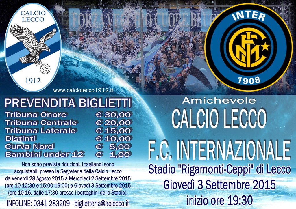 LECCO – La Calcio Lecco 1912 è orgogliosa di comunicare ufficialmente che il prossimo 3 Settembre, presso lo Stadio “Rigamonti-Ceppi” di Lecco, ospiterà in amichevole l’F.C. Internazionale di Roberto Mancini.