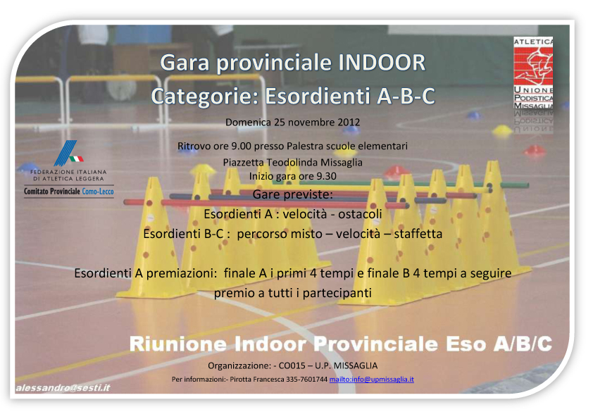 MISSAGLIA – Non solo corsa campestre in questa fase autunnale, domenica a cura dell’Up. Missaglia presso la palestra delle scuole elementari con ritrovo alle 9 e inizio gare alle 9.30 verranno proposte le gare indoor riservate alle categorie Esordienti A (2001/2/02), Esordienti B (2003/04) e Esordienti C (2005/06).