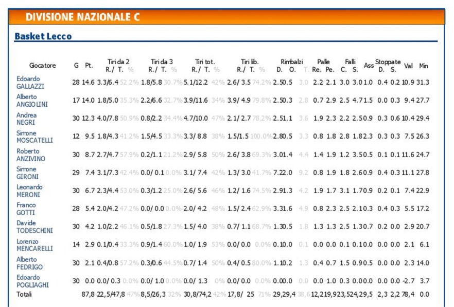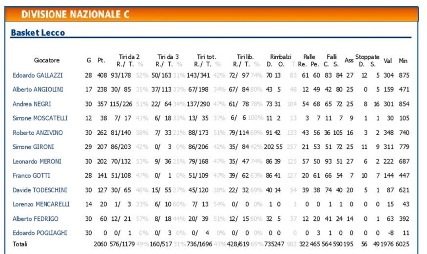Vediamo dunque come si sono comportati nel complesso i giocatori del Basket Lecco nella stagione appena finita: