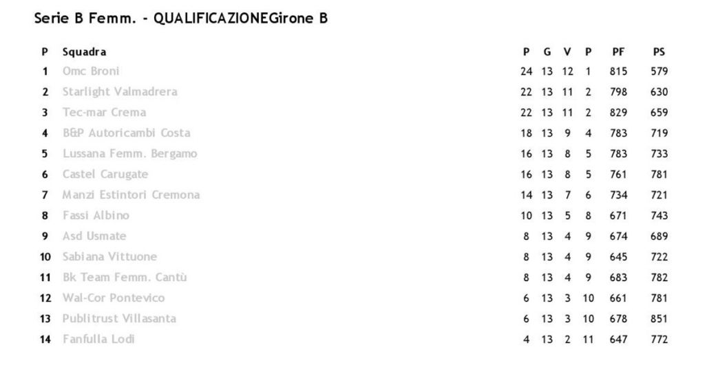 Infine, ma non da ultimo, il campionato di serie B femminile si prende ancora una settimana di riposo per ricominciare il campionato con la prima del girone di ritorno (Lodi – Valmadrera e Carugate – Costa) nel fine settimana del 14 e 15 gennaio.