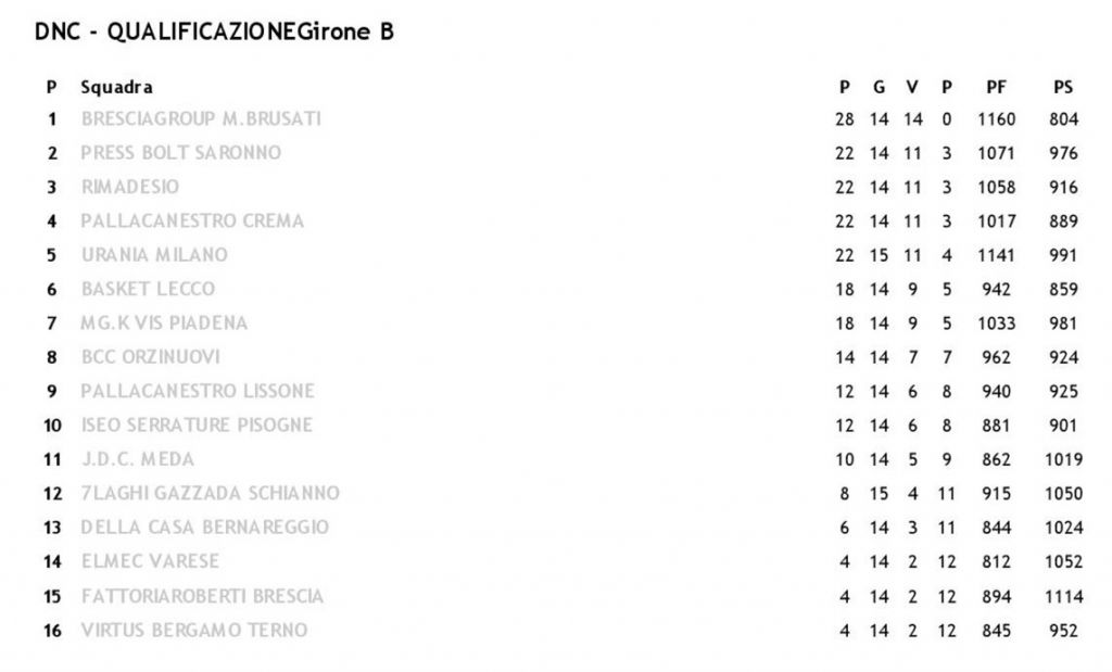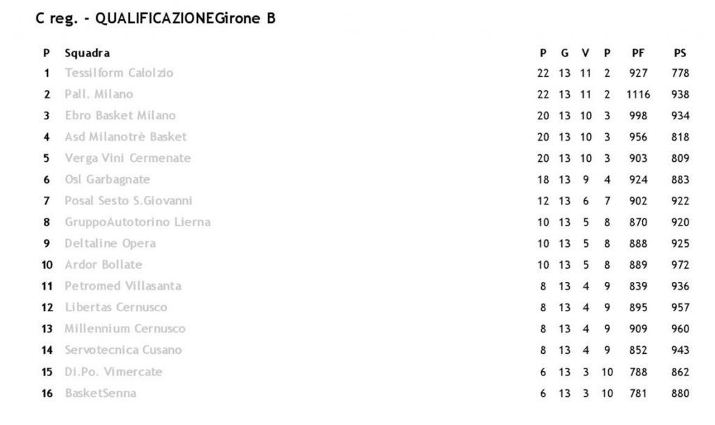 La quattordicesima giornata del campionato di serie C regionale vede impegnate, sabato prossimo, le due squadre lecchesi che ne fanno parte, la Tessilform Calolzio (prima in classifica con 13 gare giocate della quali 11 vinte e 2 perse) sarà impegnata in trasferta nella prima gara dell’anno, precisamente a Milano contro la Pallacanestro Milano in una gara decisiva per l’andamento del girone di andata visto che i milanesi sono secondi in classifica.