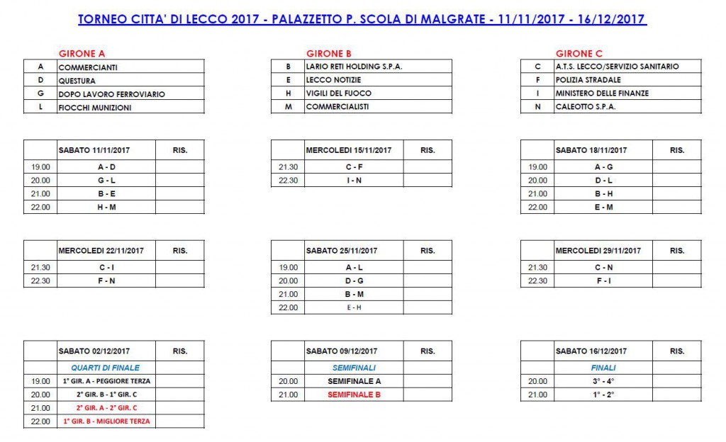 Prossima giornata di gare, in programma mercoledì 22, sempre a Malgrate. Alle 21.30 per il Girone C, seconda giornata di gare: in campo Ats Lecco contro la Finanza e alle 22.30 Polizia Stradale contro Caleotto. Al momento la situazione è la seguente: Ats e Finanza a tre punti, mentre Polizia Stradale e Caleotto a zero punti, quindi è ancora tutto possibile.