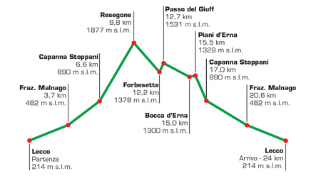 PERCORSO – Invariato il tracciato del percorso con 24km circa da macinare e un dislivello positivo di 1.800 mt. Partenza come sempre dal Lungolago di Lecco con gli atleti che dovranno raggiungere la frazione di Malnago appena sotto il piazzale della Funivia di Erna, quindi imboccare il sentiero numero 1 che porta prima al Rifugio Stoppani poi in località Piano Fieno, quindi la Bedoletta per raggiungere Pian Serada il trattato pineggiate sopra la bastionata del Resegone che porta gli skyrunner all’ultimo strappo finale che sale al Rifugio Azzoni (1877 m) tratto in cui la pendenza è talmente accentuata che gli atleti sono costretti ad utilizzare anche le mani. Dalla cima del Resegone inizia la picchiata verso l’acqua delle Forbesette, quindi di nuovo salita fino al Passo del Giuf e successivo traverso ricco di saliscendi che prta di nuovo ai Piani d’Erna, da quindi s’imbocca il sentiero della Sponda che fa da trampolino alla, ancora, lunga discesa finale con arrivo in piazza Cermanti a Lecco.
