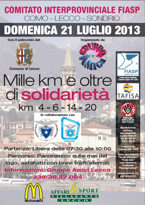 LECCO – Il gruppo Amici di Lecco in collaborazione con il Cai Lecco e il Cai Strada Storta organizzano per domenica prossima, 21 luglio, la seconda edizione della Mille Kilometri e… oltre di solidarietà, manifestazione podistica non competitiva che vedrà gli atleti impegnati su quattro distanze differenti: 4 – 6 – 14 – 20 chilometri.
