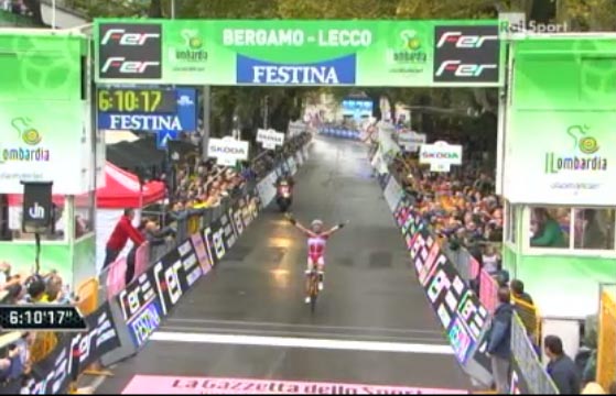 Ma non poteva essere altrimenti per il Lombardia, la rivincita del mondiale e da sempre abituata a pioggia e foschia. L’arrivo trionfante di Rodriguez che ha staccato tutti nel passaggio da Ello, a circa 9 km dall’arrivo. “Vincere così è una soddisfazione immensa” è il primo commento a caldo del vincitore.