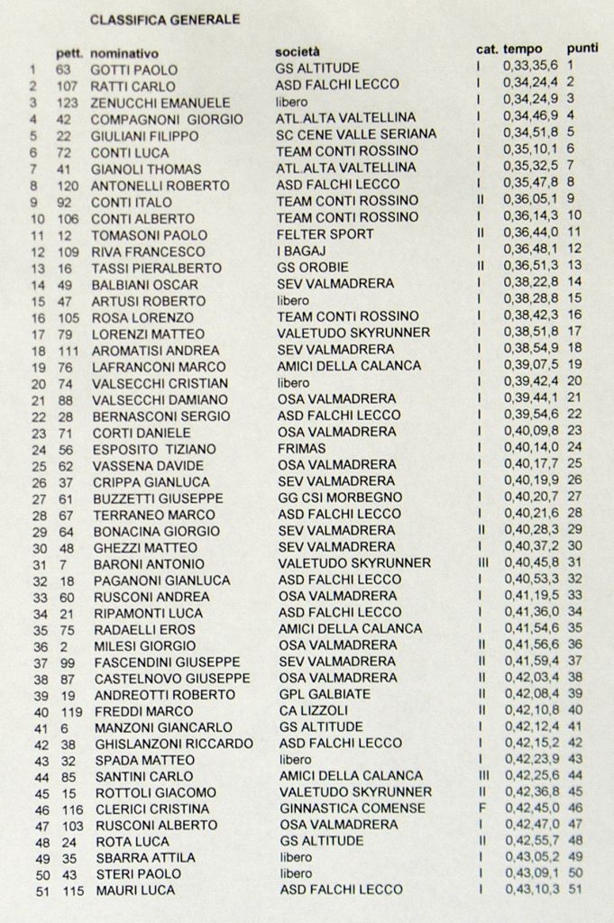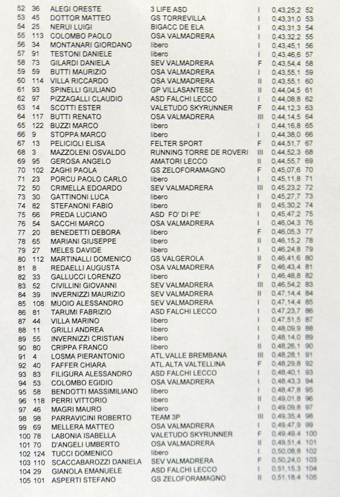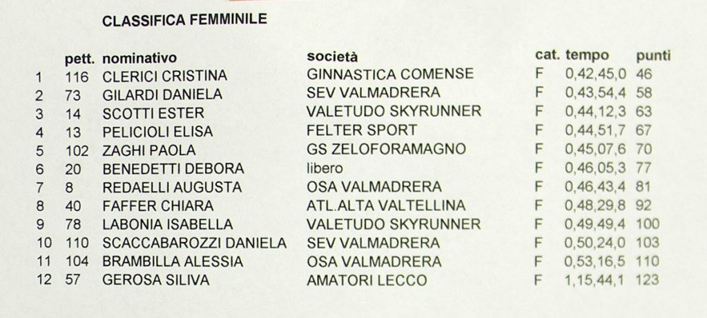 Tra le donne a salire sul gradino più alto del podio è stata Clerici Cristina della Ginnastica Comense che ha fermato il crono su 42’45”.0, seconda Daniela Gilardi della Sev Valmadrera (43′.54”.4) e al terzo posto Ester Scotti della Valetudo Skyrunner (44′.12”.3).