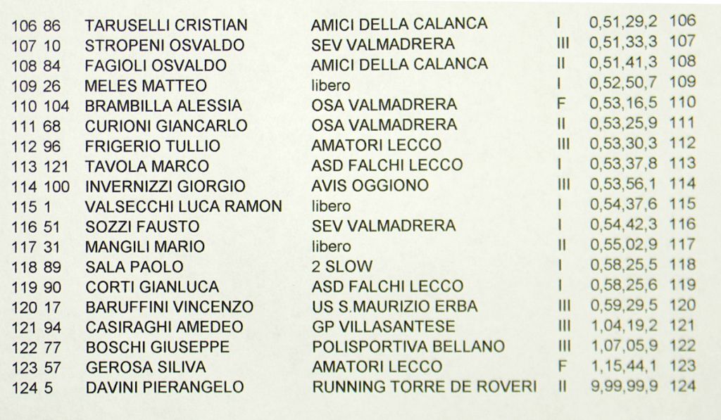 Soddisfazione anche per la presidente dell’associazione Proletari Escursionisti “Pierino Vitali”, Maria Teresa Bonacina: “E’ andata benissimo, anche il tempo è stato clemente, la partecipazione è stata massiccia con 124 atleti al via, la gara si è svolta senza nessun tipo di inconveniente quindi possiamo dire di essere pienamente soddisfatti. Ovviamente l’appuntamento è all’anno prossimo con la 25^ edizione”.