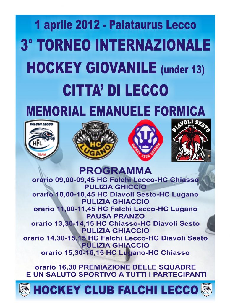 Il torneo, giunto quest’anno alla sua terza edizione e come sempre intitolato al giovane ventisettenne che nel settembre del 2010 è prematuramente scomparso in seguito a un incidente stradale, vedrà sfidarsi due formazioni lombarde della categoria under 13, i Falchi Lecco e i Diavoli di Sesto San Giovanni, e due squadre svizzere, l’Hc Lugano e il Chiasso.